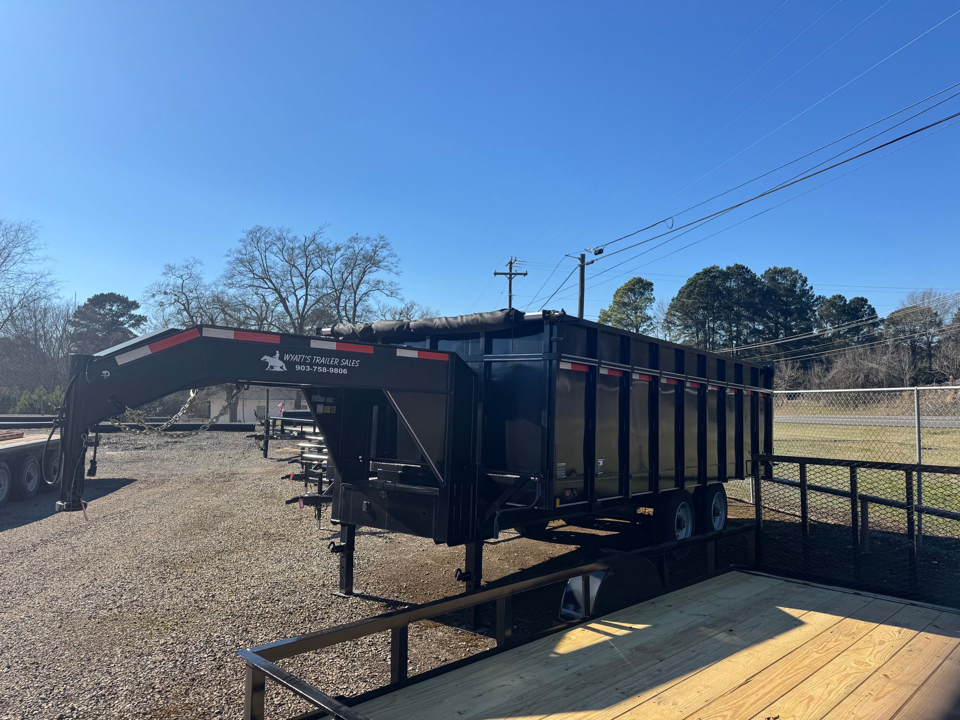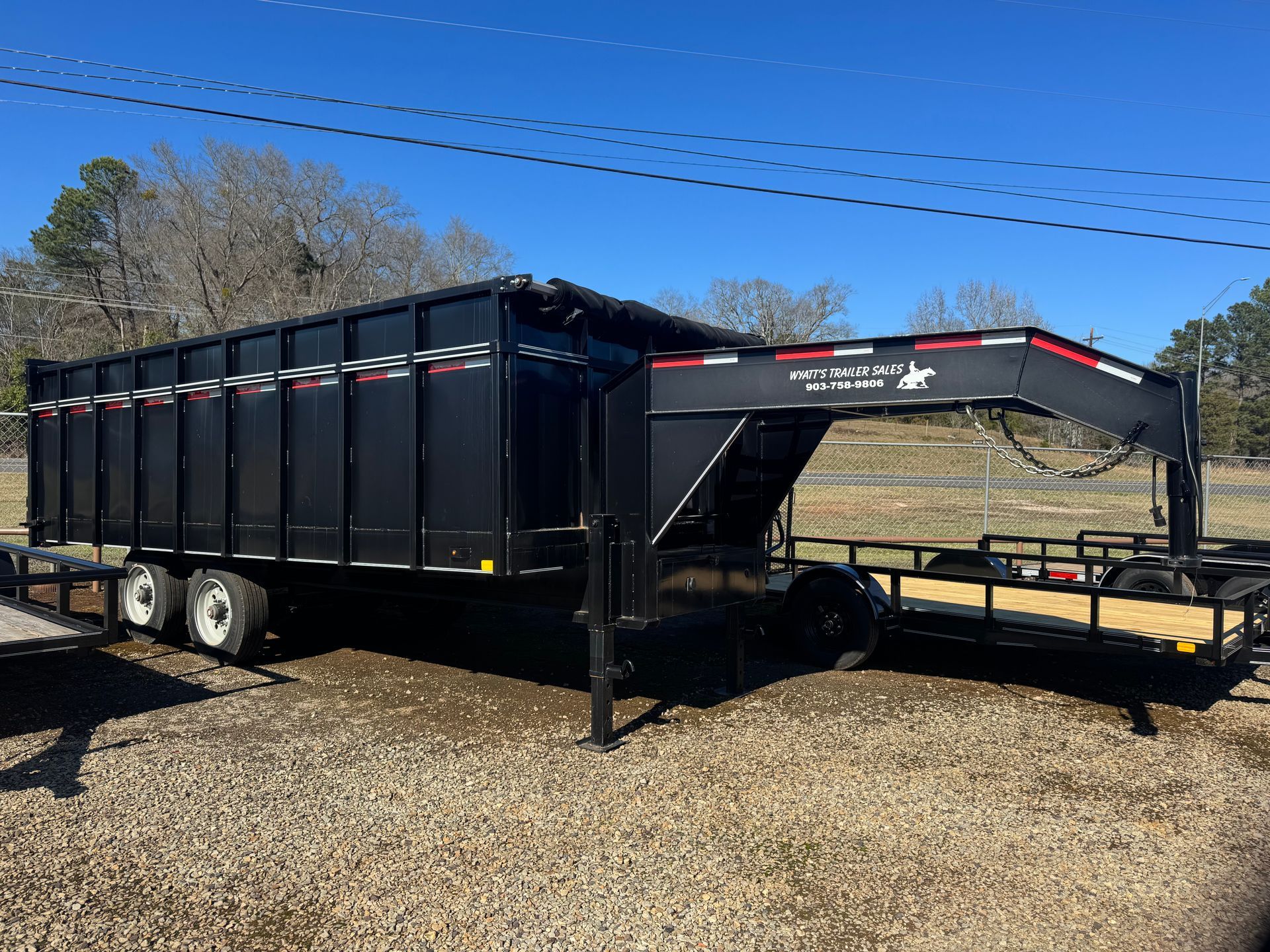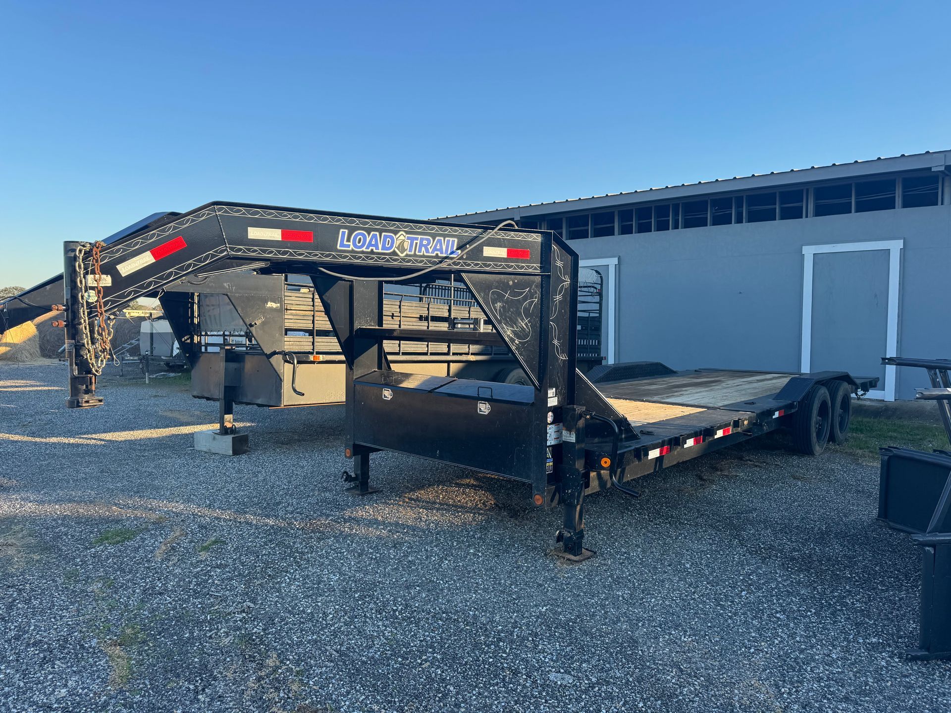2-10K drop leg jacks, 215/75/R17.5 16-ply tires with spare and mount, dual swing out gate with spreader, 7'-6" ramps and scissor lift hoist with tarp